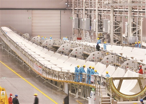 3月22日,三一重能韶山叶片工厂。这是全球风电行业首座“数字元平台”工厂,拥有全亚洲最大的单体风电叶片生产车间。记者童迪摄