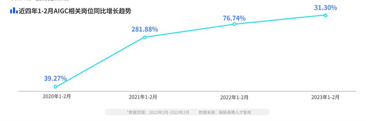 随着AIGC带来的职场变革,近两年,AIGC领域岗位数量井喷增长。2021年是AIGC人才招聘需求增长爆发期。2021年1-2月,AIGC领域岗位数量同比暴增281.88%。随着ChatGPT走红,2023年1-2月AIGC人才招聘需求数量同比上涨31.3%,创历史新高。