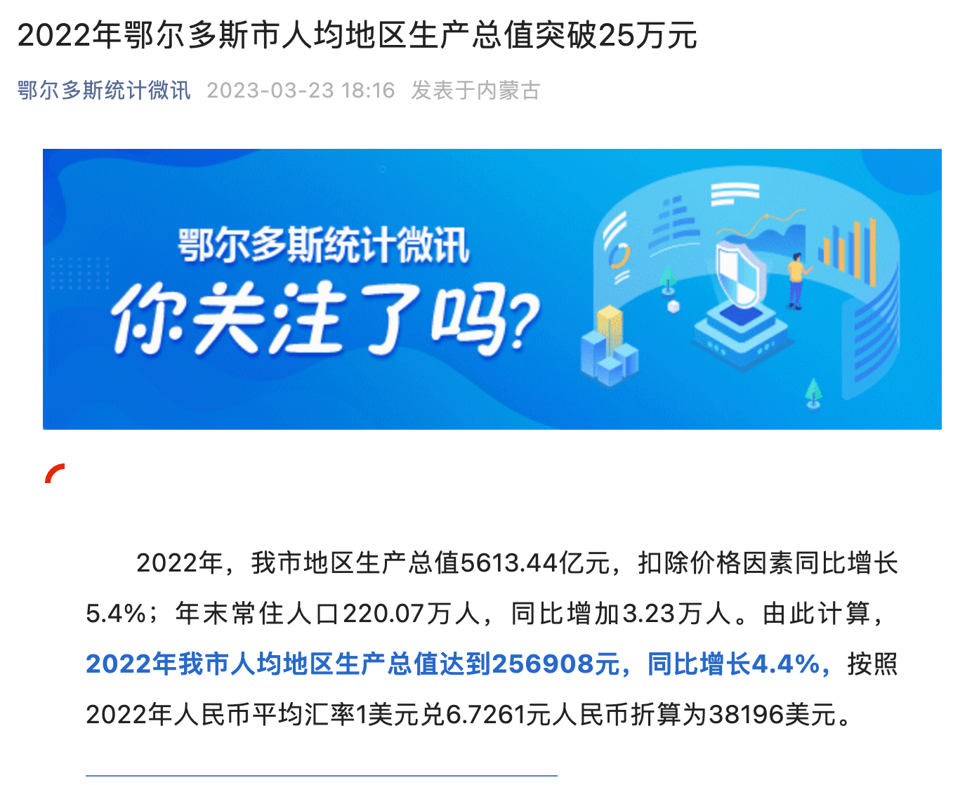 据“鄂尔多斯统计微讯”3月23日消息,2022年,鄂尔多斯全市地区生产总值5613.44亿元,扣除价格因素同比增长5.4%;年末常住人口220.07万人,同比增加3.23万人。由此计算,2022年鄂尔多斯人均地区生产总值达到256908元,同比增长4.4%,按照2022年人民币平均汇率1美元兑6.7261元人民币折算为38196美元。