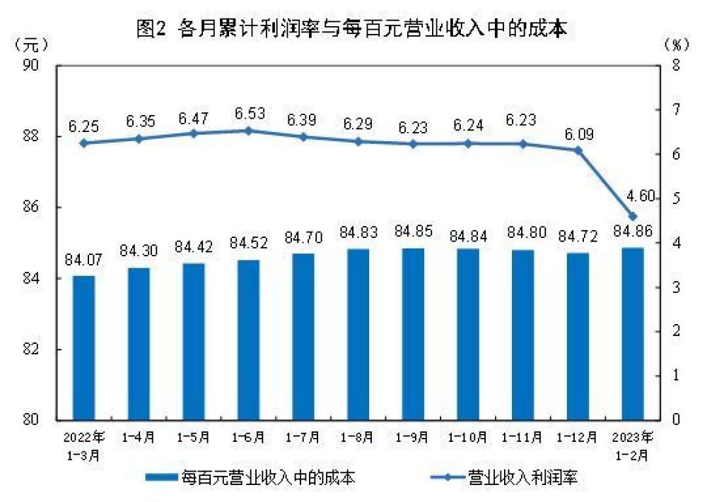 1—2月份,规模以上工业企业每百元营业收入中的成本为84.86元,同比增加0.90元;每百元营业收入中的费用为8.51元,同比增加0.20元。