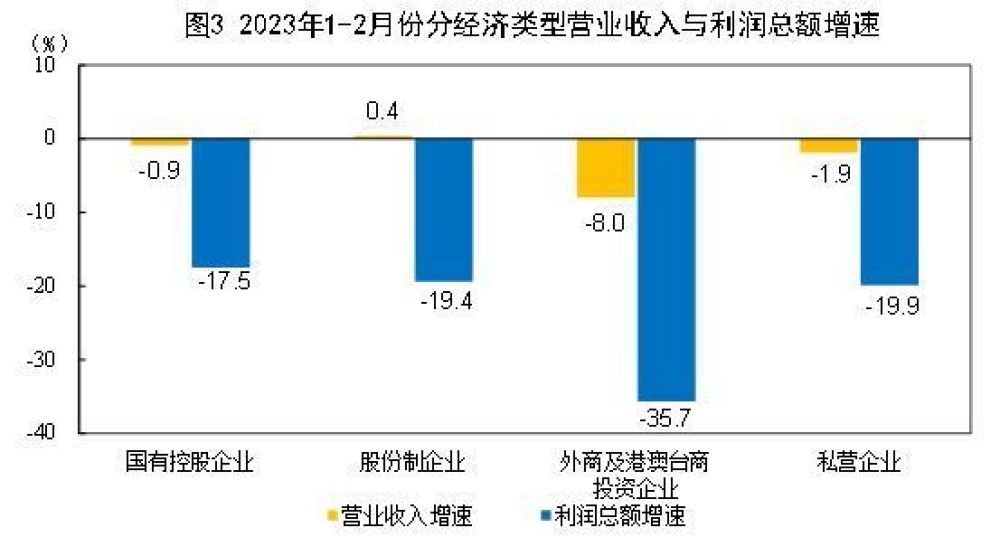 1—2月份,规模以上工业企业中,国有控股企业实现利润总额3449.1亿元,同比下降17.5%;股份制企业实现利润总额6719.0亿元,下降19.4%;外商及港澳台商投资企业实现利润总额1761.3亿元,下降35.7%;私营企业实现利润总额2559.3亿元,下降19.9%。