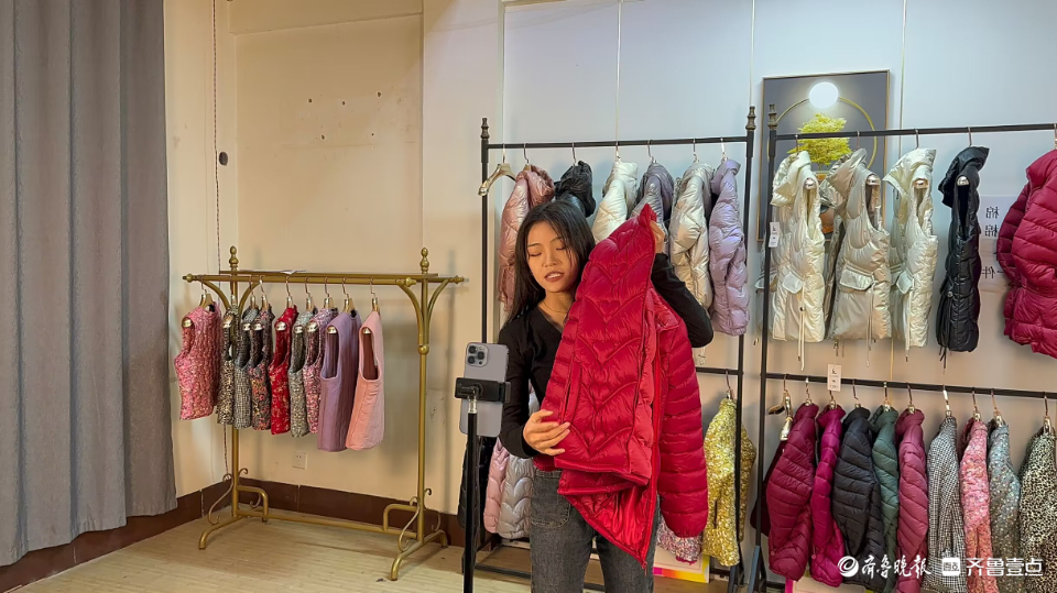 在服装厂的二楼,记者见到了负责直播带货的孙文国,他介绍,每天通过直播带货的方式能为服装厂卖出1000多单货品。此时,直播带货主播王亚茹正在直播间内介绍着产品。