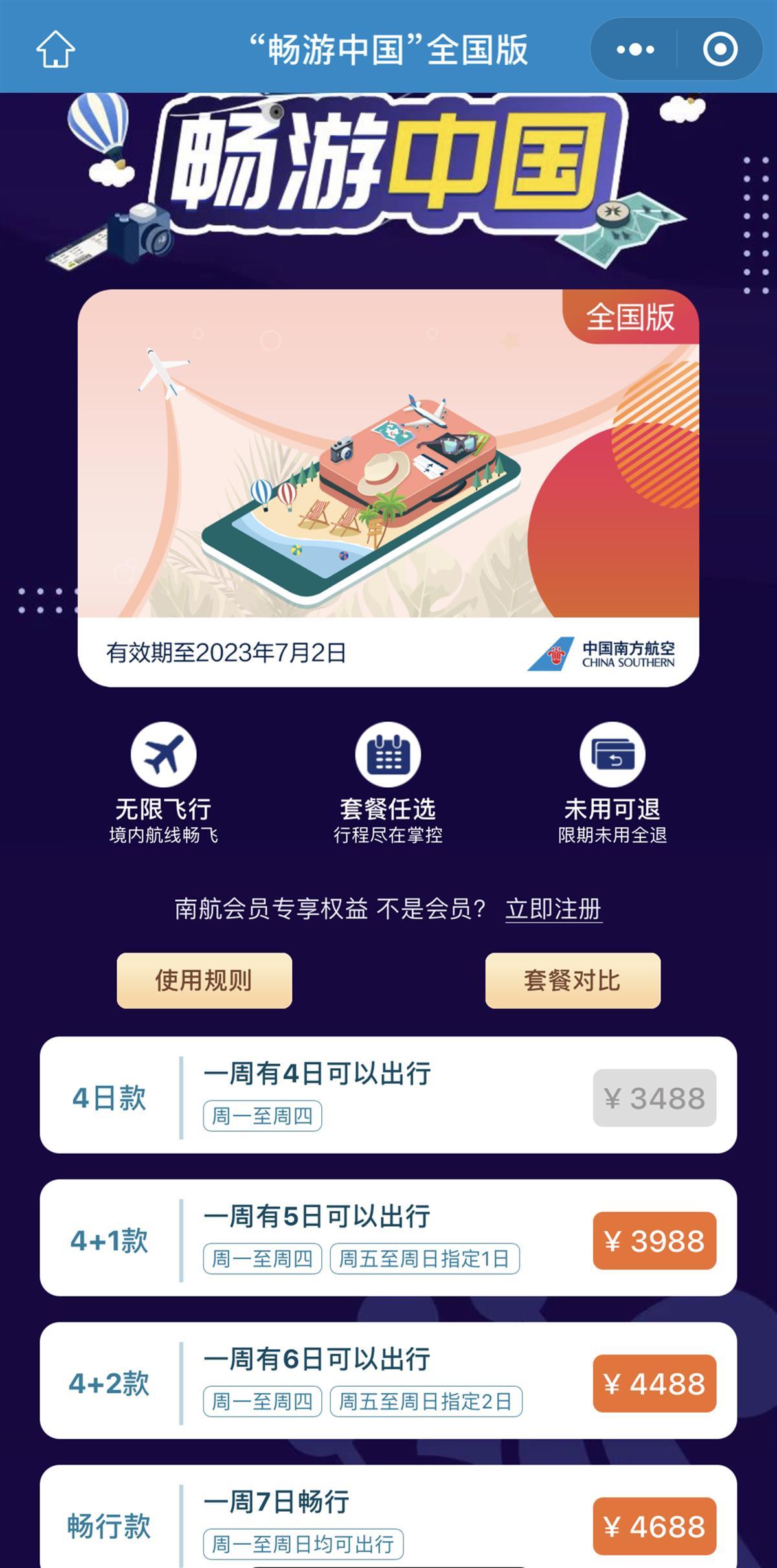 以“畅游中国”为例,购买用户需提前5个自然日(含)兑票,同一航线最多可往返2次,仅可最多同时存在3段未使用的机票。可兑换的航班及座位数以用户实际查询的结果为准。