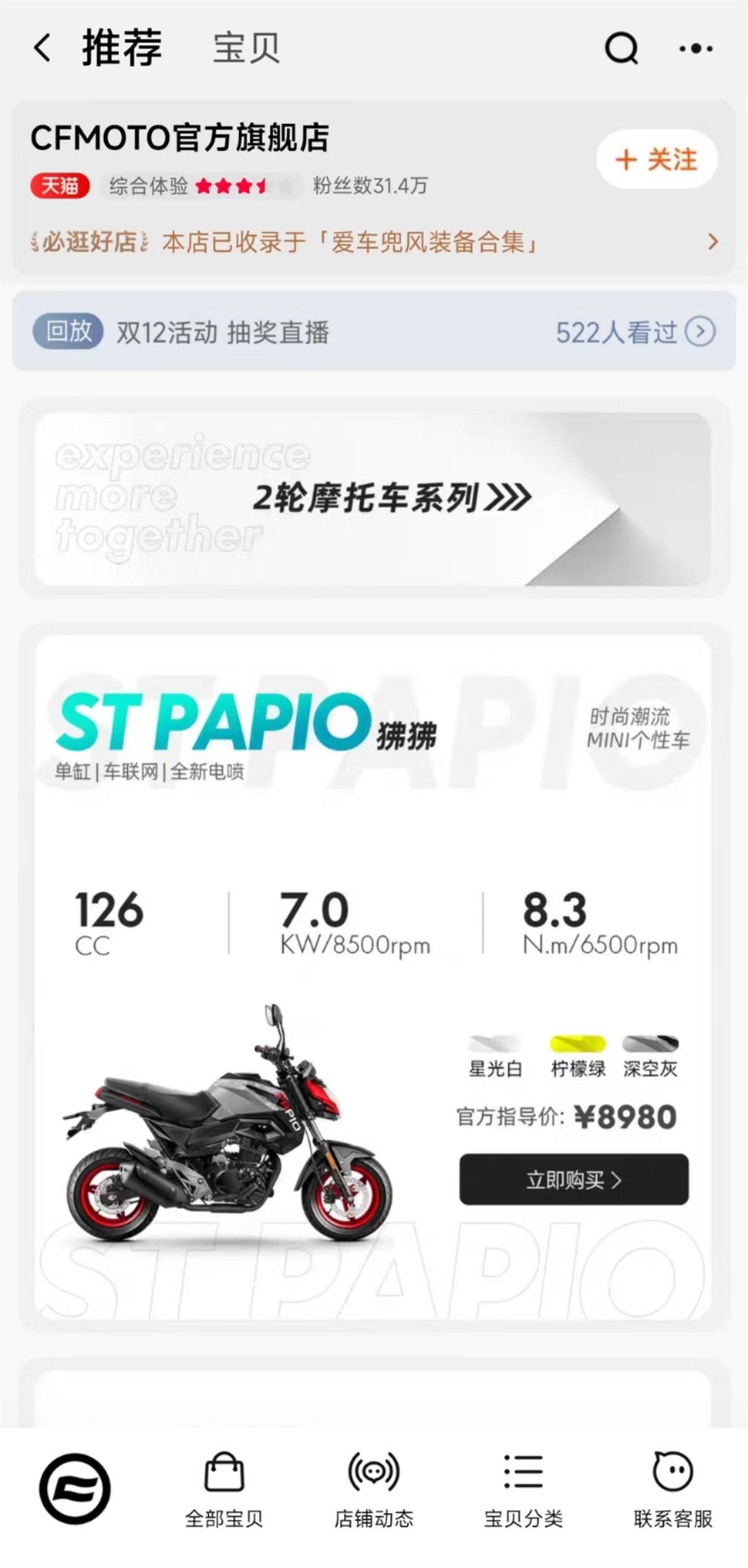 春风动力旗下“CFMOTO”天猫官方旗舰店,已开设了11年,也是不少摩托车发烧友热衷浏览闲逛的店铺之一。