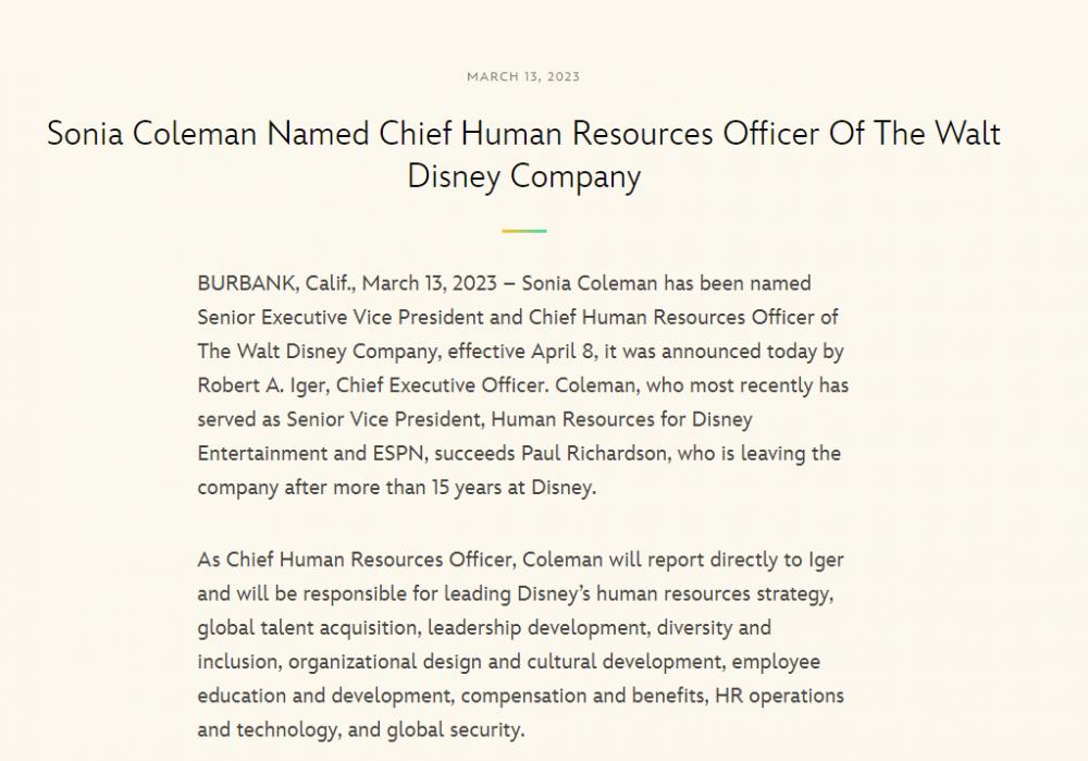 作为首席人力资源官,索尼娅·科尔曼将直接向伊格尔汇报,负责领导迪士尼的人力资源战略、全球人才招聘、领导力发展、多样性和包容性、组织设计和文化发展、员工教育和发展、薪酬和福利、人力资源运营和技术以及全球安全。