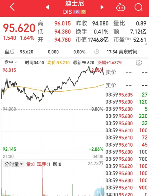 截至当地时间3月27日收盘,迪士尼报95.62美元,涨幅1.64%,市值1746.8亿美元。