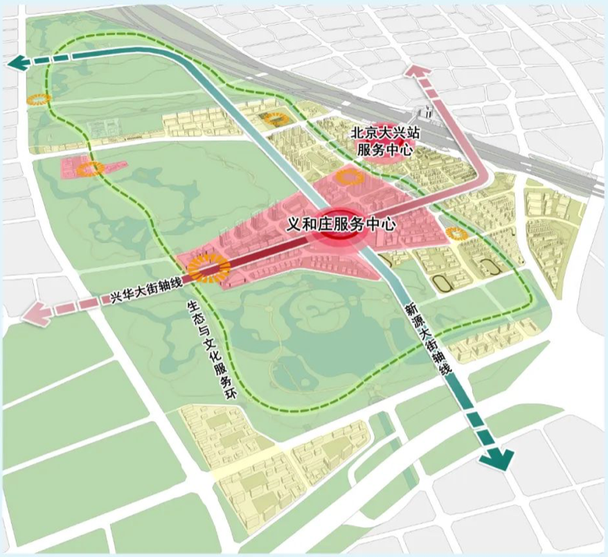 一方面,大兴新城核心区将把握大兴“两区”建设机遇,紧扣临空经济区、生物医药基地等周边产业园区的科技创新服务需求,重点布局总部办公、金融服务、商业服务、会议会展等功能,提升区域产业服务保障能力。构建“两轴两心,一环多片”的空间结构,优化职住空间布局,引导发展资源、就业岗位向京雄城际铁路北京大兴站、地铁大兴线义和庄站周边集聚,推动站点与周边用地一体化建设,打造集约高效、功能复合的活力空间。