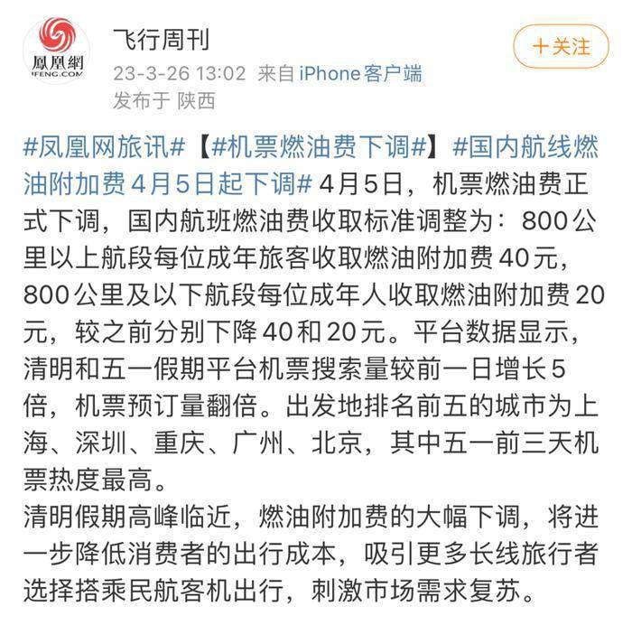 不止国际机票整体回落,3月26日,有消息称国内机票燃油附加费将自4月5日进一步下调,其中国内航班燃油费收取标准调整为800公里以上收取燃油附加费40元,800公里以下收取20元,较之前分别下降40元及20元。