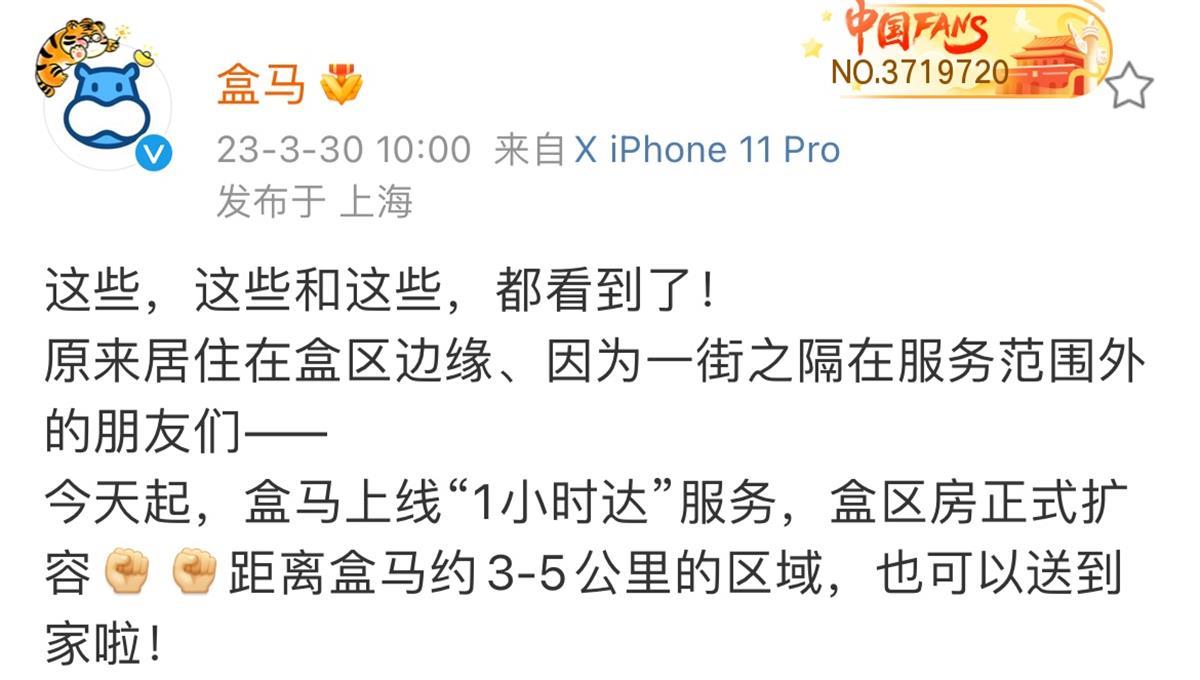 记者了解到,此前盒马的配送服务标准一直是“3公里内30分钟送达”,超出此范围的消费者只能到店购买。各大社交平台上,不少网友戏称自己为“盒区边缘人”,发帖称自己“离盒马配送只差一条街”“只要扩大盒马配送范围,付邮费也可以接受”。数据显示,盒马约5.4%的线上订单,是由非盒区房用户下单到离家最近的停车场、十字路口等边缘地带。