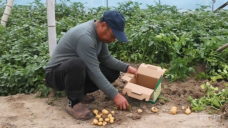 洋芋种植大户王回做在大棚里采收洋芋(央广网记者俞烨摄)