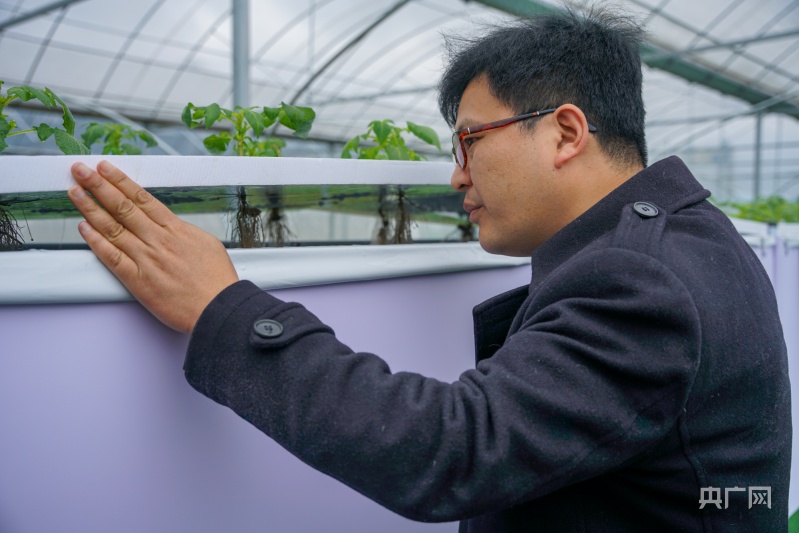 农业技术专家检查纳米气雾栽培区洋芋生长情况(央广网实习生吴思涛摄)