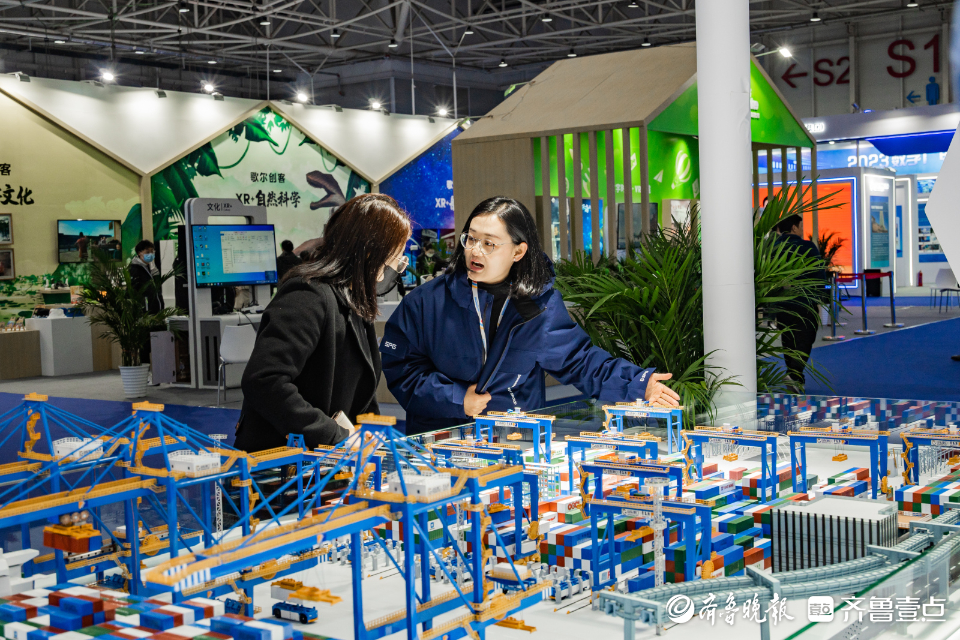 在“哈舅”的右手边,是青岛港的展出位置。在青岛港的展厅里,一个山东港口青岛港全自动化集装箱码头的微缩模型吸引了记者的眼球,据介绍。青岛港全自动化集装箱码头是全国目前作业效率最高的全自动化码头。来参观的市民中,有许多不了解全自动化码头的运作方式,通过展厅工作人员的专业介绍,记者和市民在这座模型中得到了答案——在码头上,自动化桥吊从船上抓取各类颜色的集装箱,无人运输车则负责把箱子从海边运到堆场,全自动高速轨道吊将集装箱吊运到堆场指定位置进行堆存……一个进口集装箱在全自动化码头的港口之旅就这样呈现在观众面前。