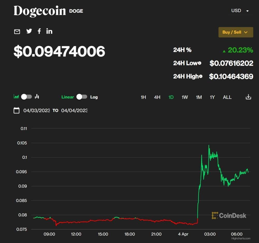 受到该消息影响,狗狗币应声大涨,短时间内从0.077美元附近涨至0.104美元上方,交易价格创2022年12月以来新高,涨幅一度超30%。根据全球币价网站CoinGecko数据,在本轮上涨中狗狗币总市值达到134.52亿美元,市值跻身加密货币市场排名第八的位置。