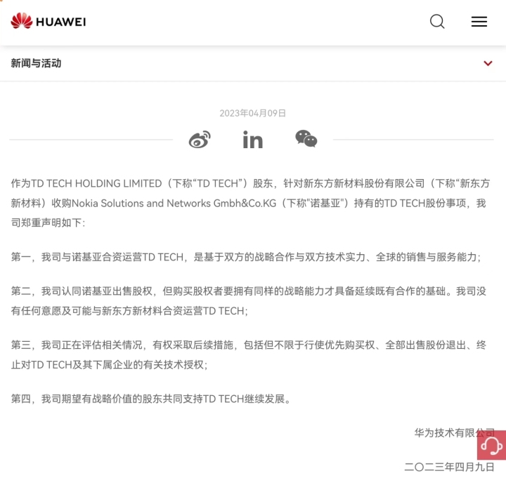 针对东方材料收购TDTECH公司,华为发表公告,不同意。