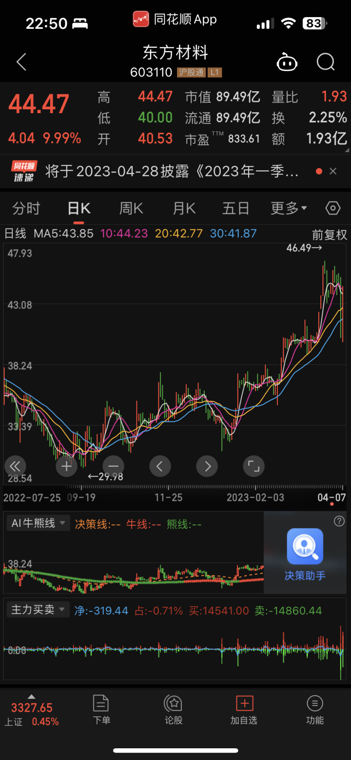 4月7日,东方材料股价以涨停报收;2019年以来,东方材料股价最大涨幅达649%。