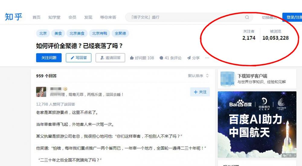 ▲知乎上《如何评价全聚德?已经衰落了吗?》热帖已有上千万人浏览。图片来源/网页截图