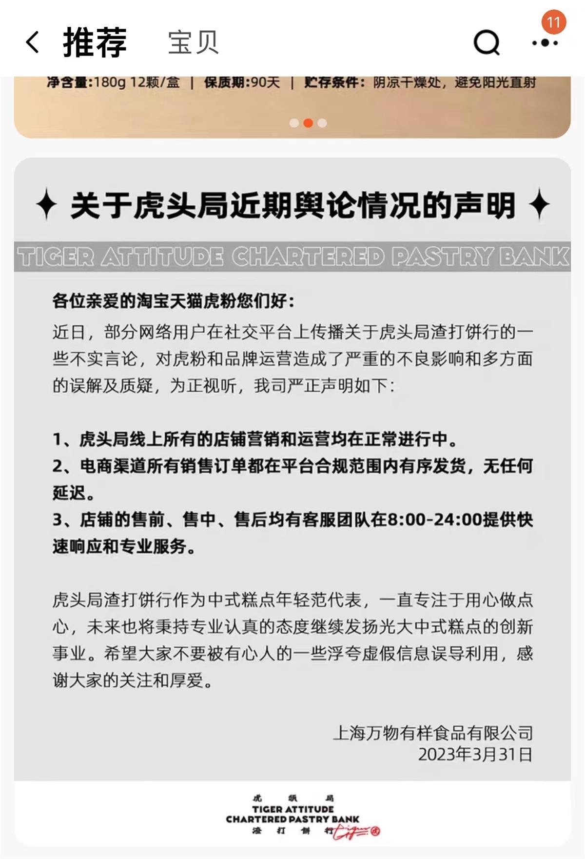 针对相关传闻,虎头局天猫旗舰店也发布了声明称,近日部分网络用户在社交平台上传播关于虎头局渣打饼行的一些不实言论,对虎粉和品牌运营造成了严重的不良影响和多方面的误解及质疑。并声明,虎头局线上所有的店铺营销和运营均在正常进行中;电商渠道所有销售订单都在平台合规范围内有序发货,无任何延迟;店铺的售前、售中、售后均有客服团队在8:00至24:00提供快速响应和专业服务。