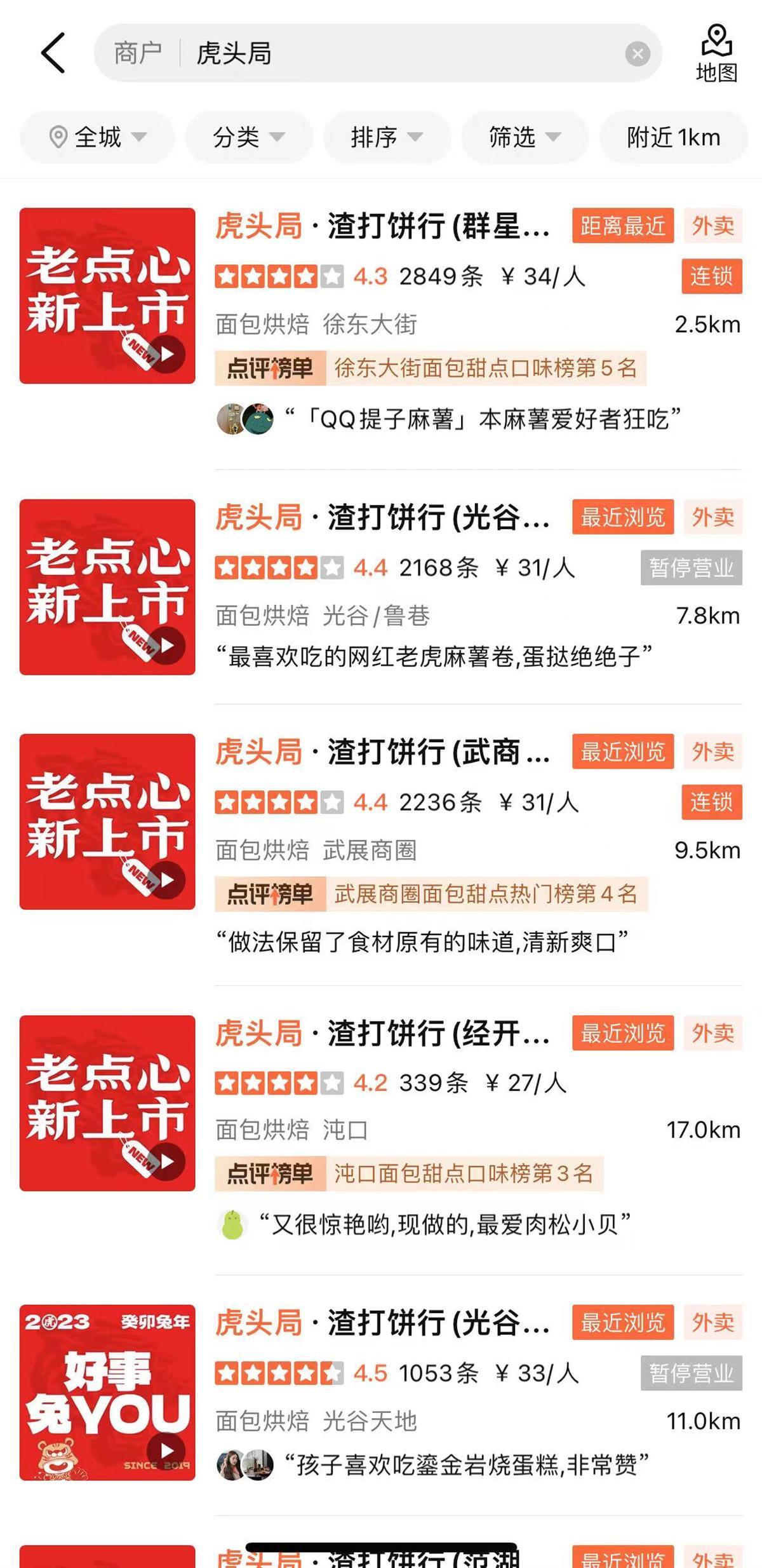 随后,极目新闻记者在大众点评上搜索“虎头局·渣打饼行”,共显示了7家门店,其中光谷世界城店、范湖地铁站店、光谷天地店为暂停营业状态,群星城店、武商MALL·世贸店、经开永旺店、佰港城店正常营业中。
