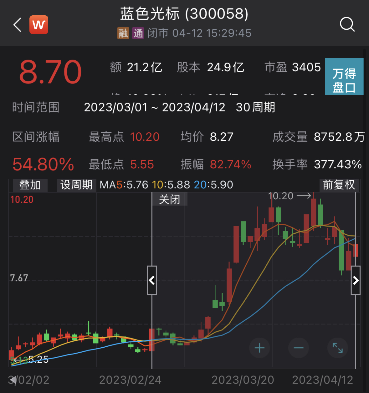 近日,蓝色光标因蹭上了AIGC的热度而受到市场的追捧,自3月1日以来,股价区间涨幅已达到54.8%。