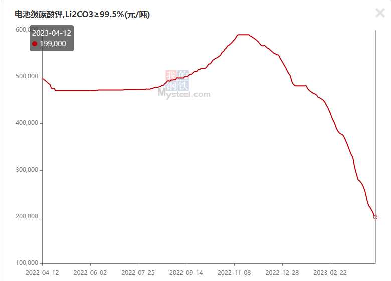 2023年4月12日,电池级碳酸锂价格正式跌破20万元/吨大关。