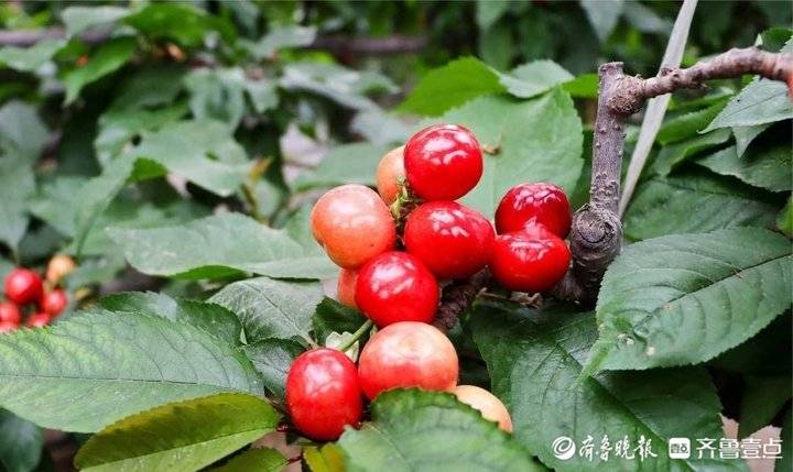 在长尾崖村樱桃种植基地农户的大棚里,樱桃的清新香甜瞬间扑鼻而来,纵横交错的枝丫遍布绿叶,一颗颗圆润饱满的果实错落有致地点缀在绿叶之间,更衬得娇俏可爱。这里的樱桃不仅外形娇俏,而且色香味浓,肉厚多汁,随手摘一颗,咬一口风味浓郁,软滑酸甜,樱桃汁在味蕾中四溢开来。