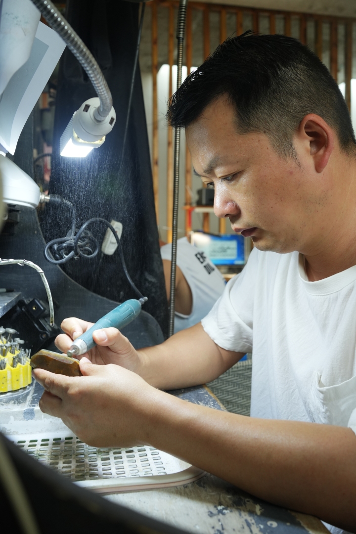 当时翡翠生意很好做,也很少有学院派的人做玉雕,对我来说是一个机会。到2012年我就成立了“觉石工作室”,师傅带徒弟,做一些高端的私人定制,最多的时候工作室有30多个人。我们的工作就是对原石进行雕刻设计,更多的是关注于自己的创作。