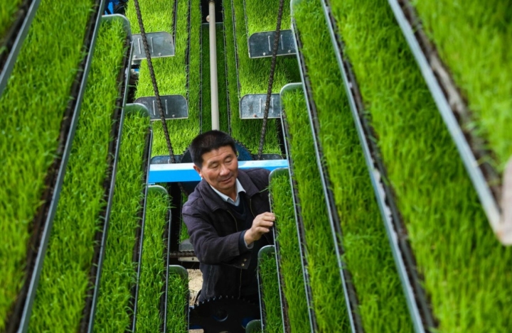 在河南省信阳市光山县罗陈乡张楼村青龙河合作社全自动智能化育秧工厂,农民在观察水稻秧苗生长情况(3月26日摄)。新华社照片