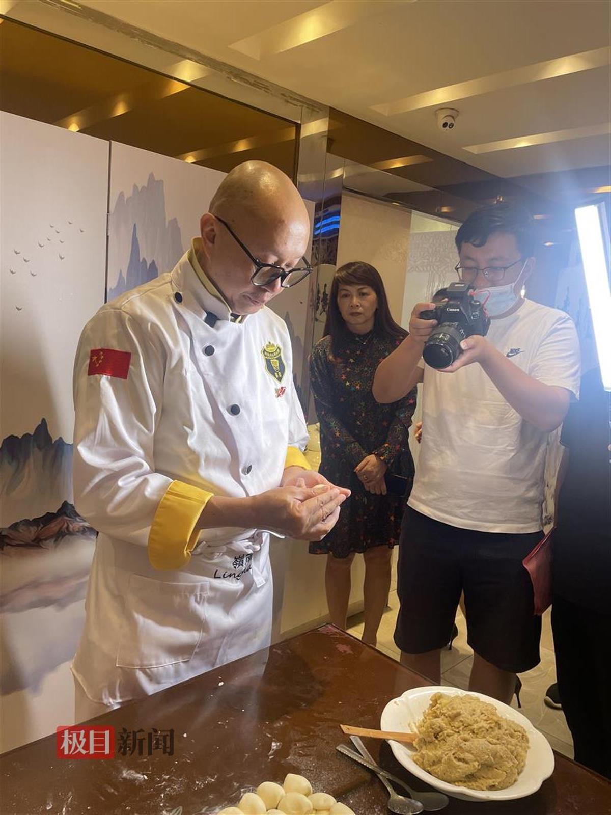 活动现场,丘卫国现场表演了点心制作技艺。尽管早已组建了自己的餐饮管理公司,多年不再亲自下厨的丘卫国,在表演时依然展现出了扎实的制作功底。