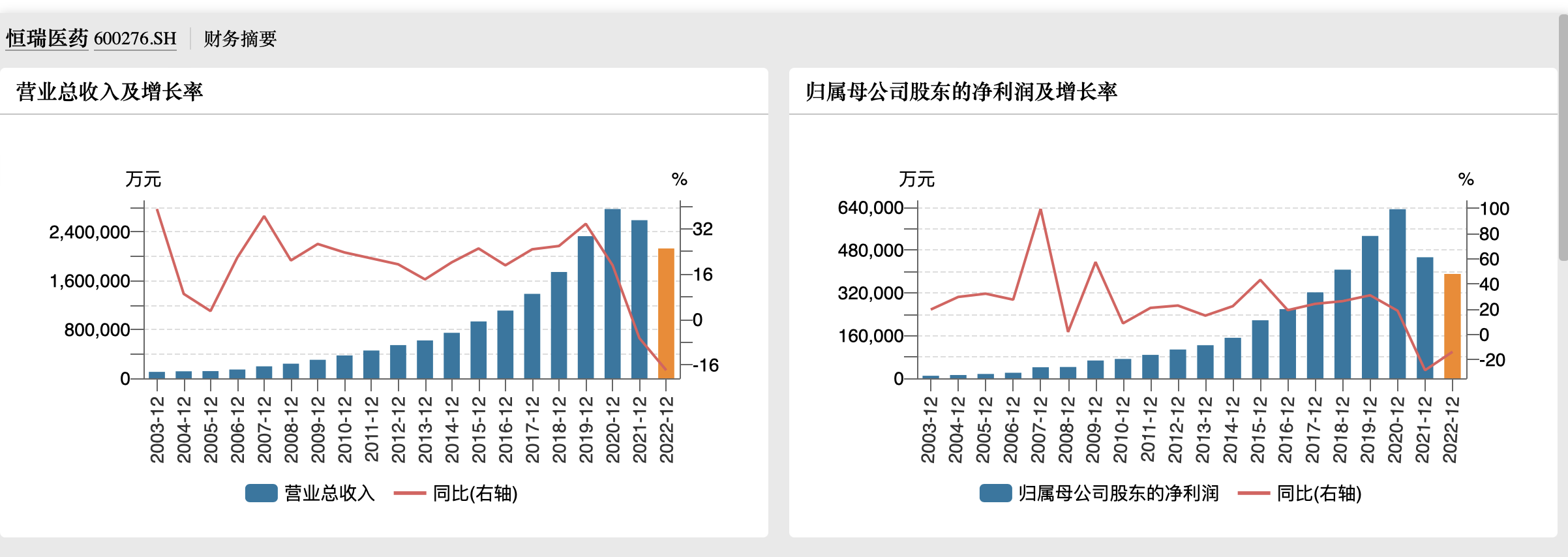wind数据显示,这是恒瑞医药2000年上市以来,第二次营收、净利润同比下降。2021年,恒瑞医药首次出现年度营收、净利同比增长率均为负的情况。
