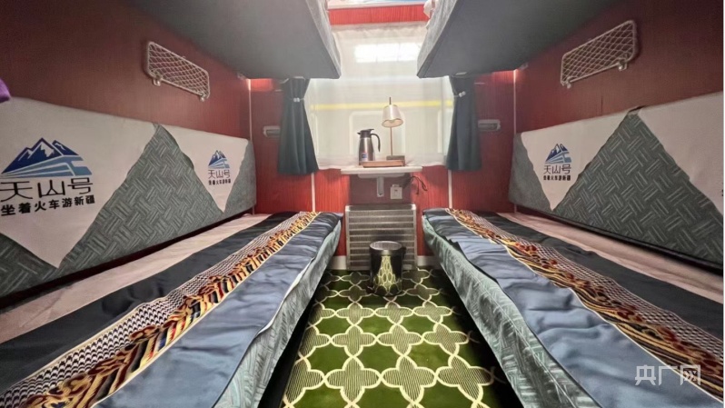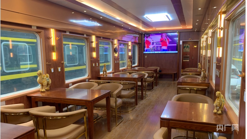 “坐着火车游新疆·天山号”专列采用25G空调车体改制而成,由软卧车厢、硬卧车厢、多功能休闲车厢、酒吧车、餐车组成。即使全程不下车,也是极致的休闲体验。厢内的所有设施都是根据客户需求量身打造,就像是一座会动的五星级酒店。白天停站后,可以下车拍照打卡,不用中转,不用换铺。
