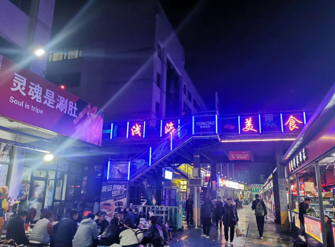 牧羊村烧烤店位于淄博市张店区浅海美食城,淄博烧烤火了以后,这座美食城几乎变成了烧烤城。一到晚上,来这里的除了食客,还有很多人是来蹭流量的。