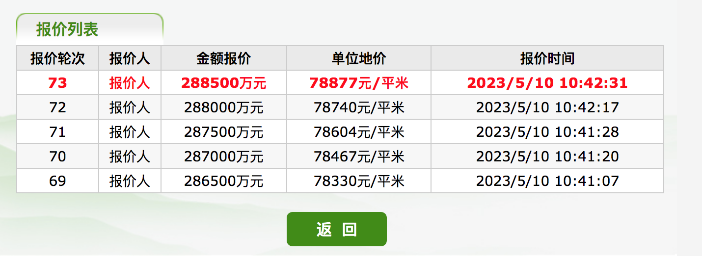 中指研究院监测数据显示,该地块曾在2022年三批次中现身,当时挂牌价15.4亿元,折合楼面价23576元/平方米,但在开拍前被延期,而此次挂牌总价直降3.3亿元。该地块被称为“回锅肉”,共吸引约20家房企报名争抢,该地块开拍37秒就触及最高限价13.8亿元并进入摇号环节,最终成交楼面价21127元/平方米,溢价率14.05%,成为此次土拍最大“黑马”。经现场摇号,该地块由厦门象屿集团旗下江苏象屿房地产开发有限公司以13.9亿元竞得。
