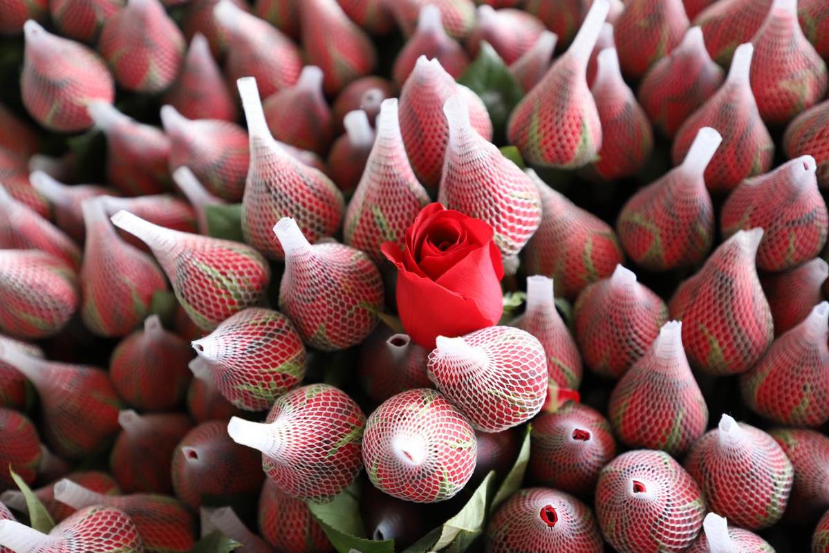 修剪枝叶、套上网套、采摘花朵、打包装箱……,每天一大早,玖玥玫瑰种植专业合作社负责人赵小光就与四五十名花农忙碌在花海中。这边黄色玫瑰明艳动人、那边粉色玫瑰妖艳欲滴,赵小光告诉记者,为了保持花型,红色玫瑰都套上了网套。“红色玫瑰的花朵成熟以后都比较大,所以要给它套上网套让它到达客户手中的时候仍然是最好的状态和花型。现在我们玫瑰园已经进入采摘季,每天下花量是两万多只。”赵小光介绍道。