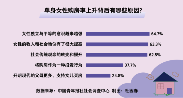 近些年,单身女性购房率比以前有了很大提升。这背后有哪些原因?调查显示,64.7%的受访者归因于女性独立与平等的意识越来越强,63.3%的受访者认为是女性的收入和社会地位有了很大提高,62.5%的受访者指出是社会传统观念的转变和提升,37.7%的受访者觉得是将购房作为了一种投资行为,24.8%的受访者表示开明现代的父母更多,支持女儿买房。