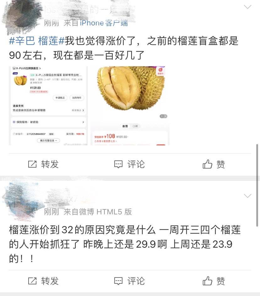 一时间社交平台开始讨论,辛巴凭借一己之力扰乱市场,相关话题冲上热搜,有消费者评论道:“就说为什么榴莲又涨价了,原来是辛巴。”不过,广州市场监管局对媒体表示,辛巴带货过快造成供求发生变化,但没有证据证明其垄断市场。