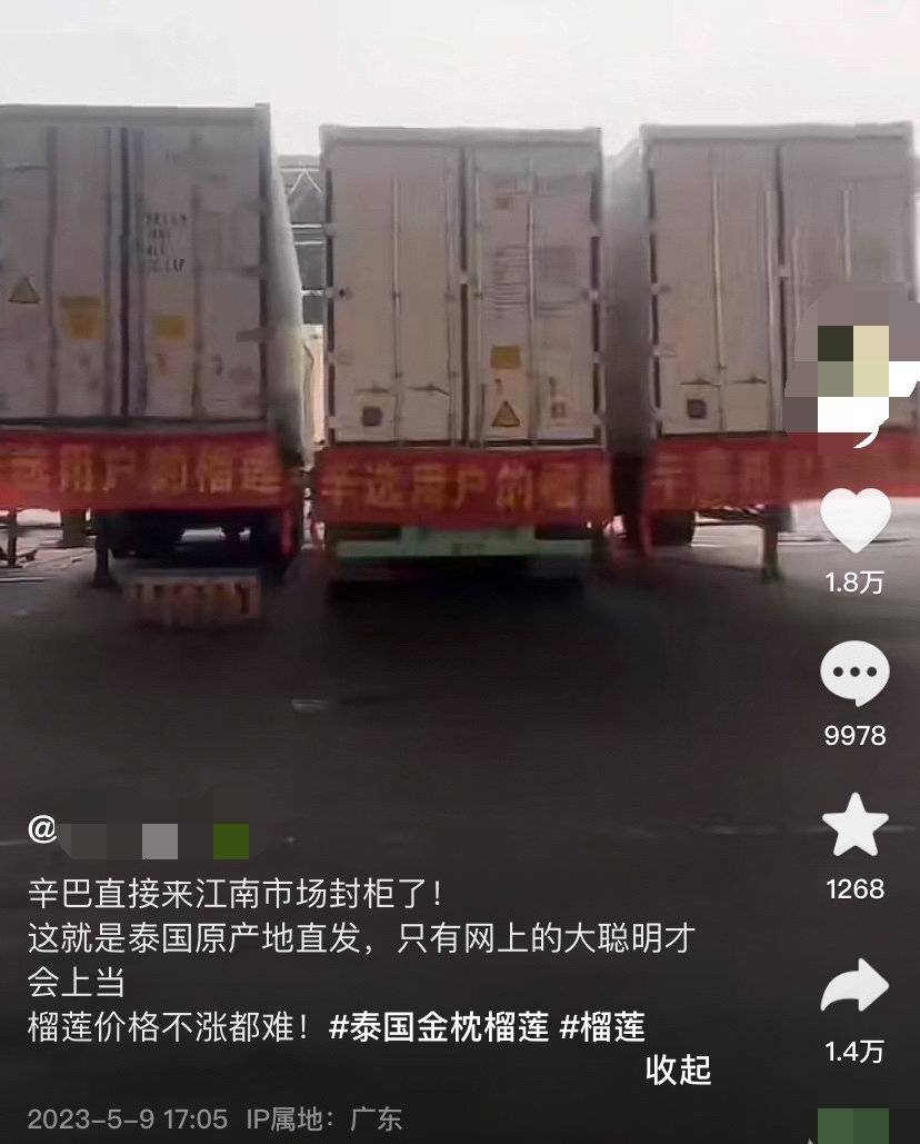 “明天价格要大涨!”一名商家5月9日发布的视频显示,辛巴带货直接导致江南水果批发市场部分货源封柜(一柜相当于一个集装箱),榴莲价格将大涨。另一名商家则在视频中说道:“整个市场冷冷清清,不是没有货,而是不卖货,辛巴同学一句家人们,160多万个榴莲把产地的价格搞起来了。”