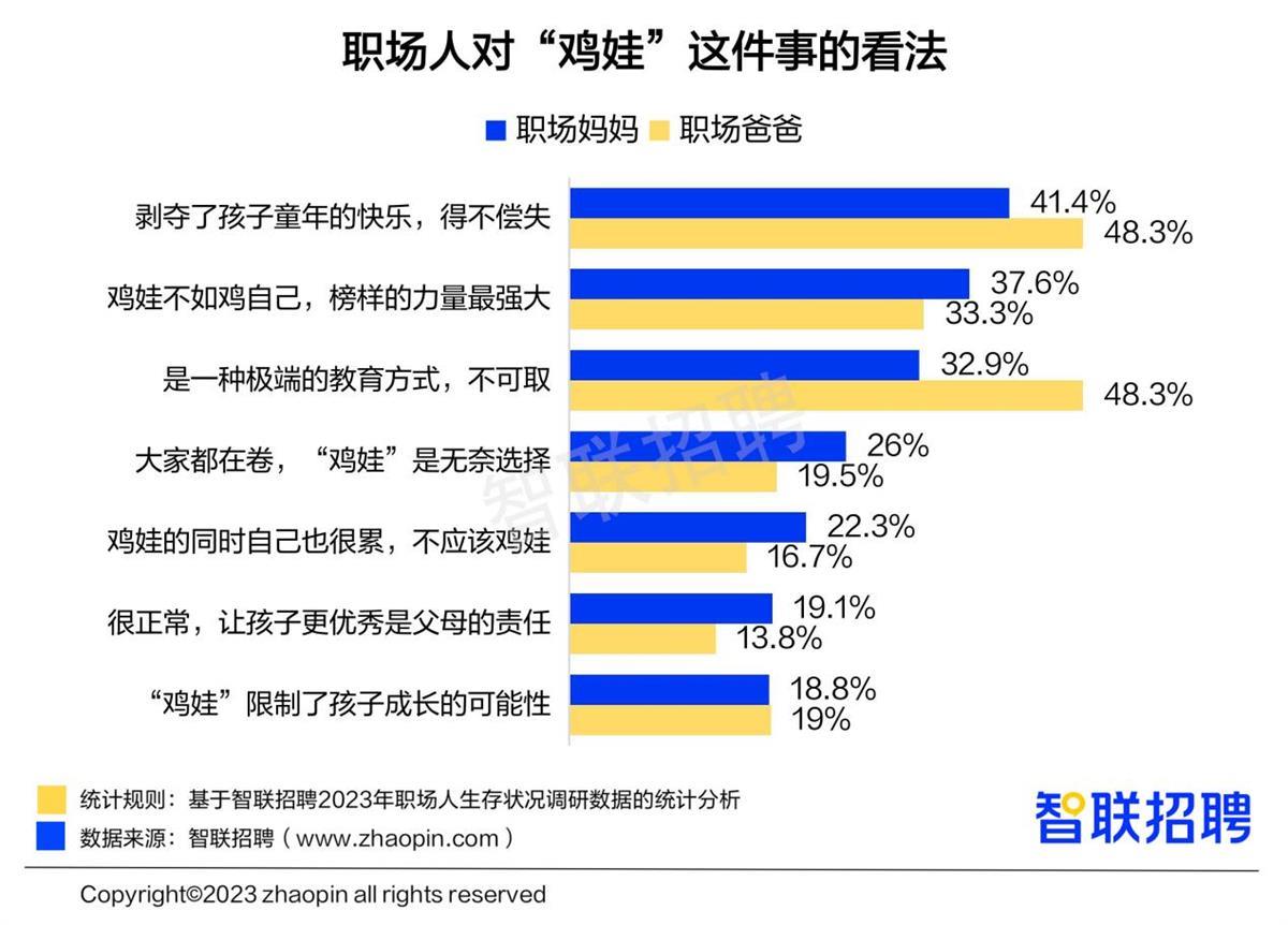 近年来,“鸡娃”成为热门话题,甚至受到全社会关注。调研显示,45.8%的职场妈妈否认自己“鸡娃”,仅有17.9%认为自己给孩子“打鸡血”。深入挖掘职场人对这一问题的看法,41.4%的职场妈妈认为“鸡娃”剥夺了孩子童年的快乐,这样做得不偿失;还有37.6%的职场妈妈认为“鸡娃不如鸡自己,榜样的力量最强大”,排在各选项第二位,可见相当一部分职场妈妈能够认识到通过提升自己来引导和教育孩子的重要性。