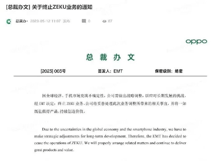 对于解散ZEKU,OPPO称,面对全球经济、手机市场的不确定性,经过慎重考虑,公司决定终止ZEKU业务。这是一个艰难的决定,公司会妥善处理相关事宜,并将一如既往做好产品,持续创造价值。