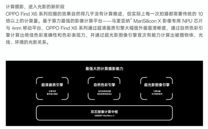 今年3月21日,在全新影像旗舰FindX6系列发布会上,OPPO还重点介绍了影像计算平台——马里亚纳®️MariSiliconX影像专用NPU芯片与4nm移动平台。