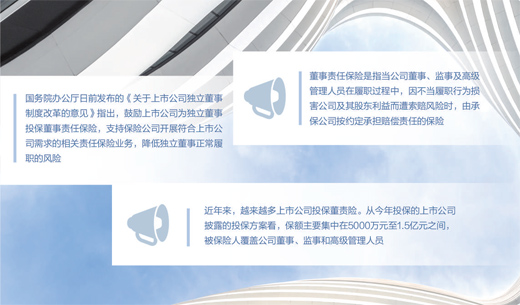 国务院办公厅日前发布的《关于上市公司独立董事制度改革的意见》提出,鼓励上市公司为独立董事投保董事责任保险,支持保险公司开展符合上市公司需求的相关责任保险业务,降低独立董事正常履职的风险。业内人士认为,这为更好发展董责险释放了积极信号,同时也将有利于更好发挥独立董事作用。