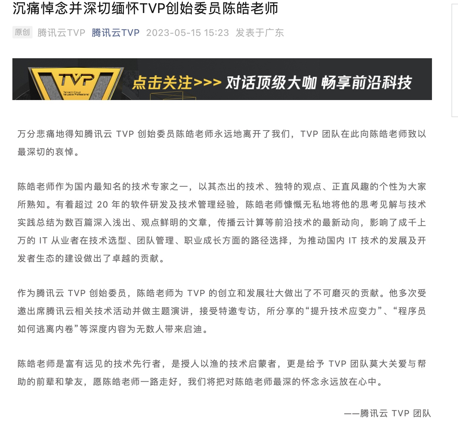 5月15日,腾讯云TVP团队发布了一篇悼文。陈皓是腾讯云TVP(腾讯云最具价值专家)的创始委员。