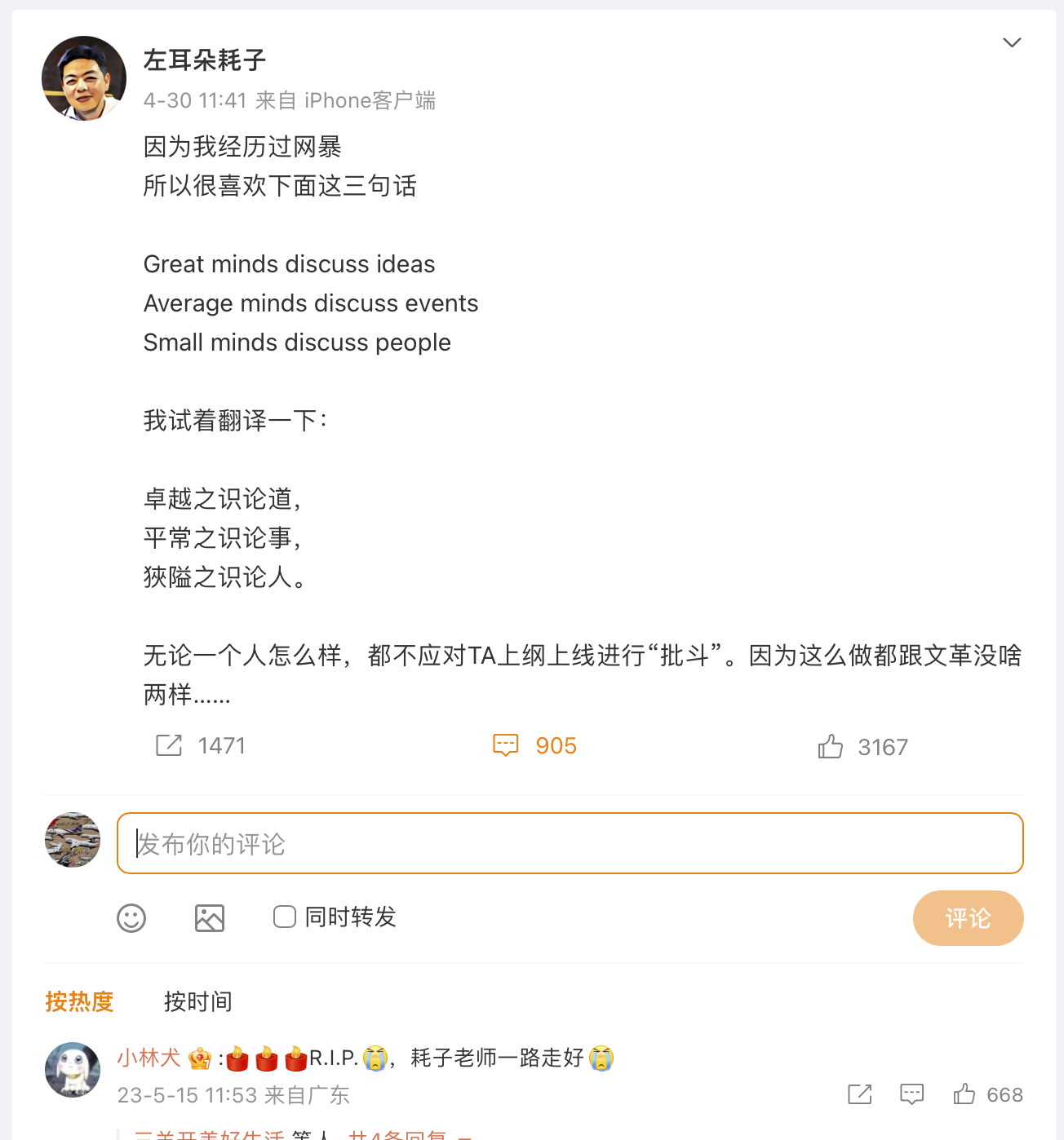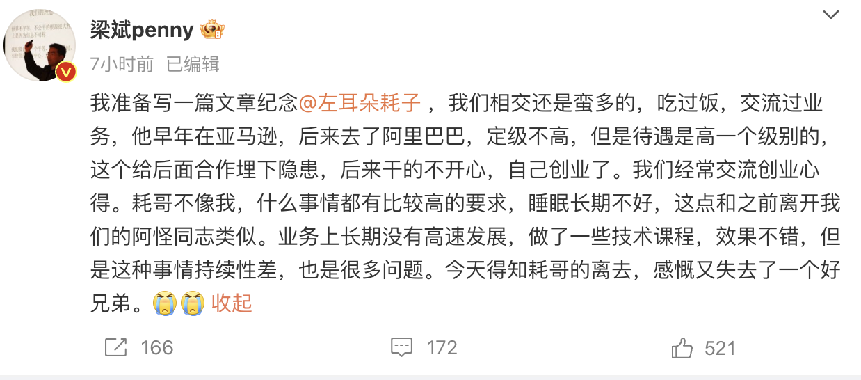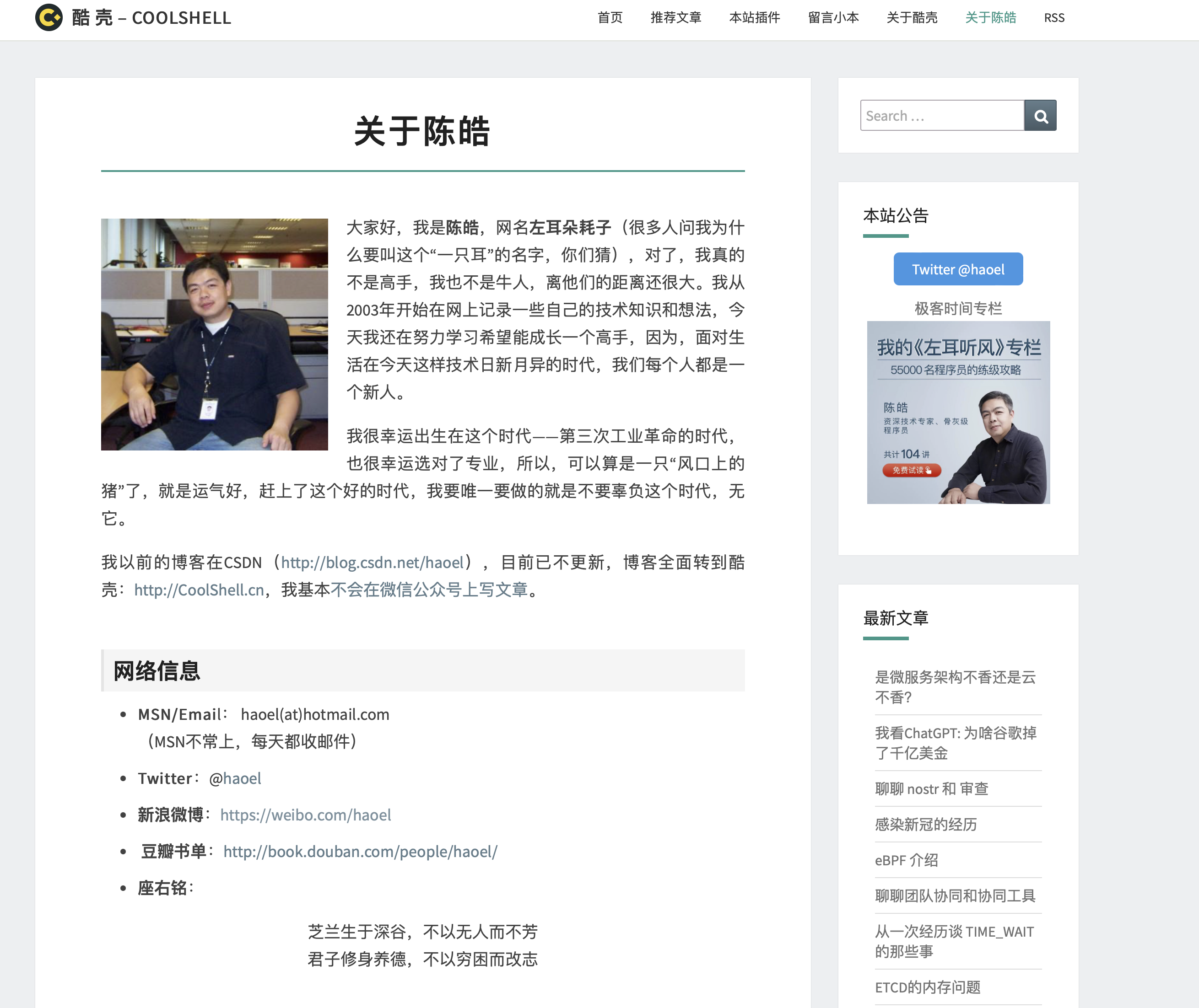 与此同时,陈皓在网络上也非常活跃,经常更新自己的技术思考和想法。比起原名陈皓,他的网名“左耳朵耗子”更为人熟知,还有不少后辈程序员亲切地称呼他为“耗子叔”。由于陈皓在广大程序员群体中拥有广泛的知名度,因此他去世的消息一度登上了微博热搜,大家纷纷表达对他的悼念。