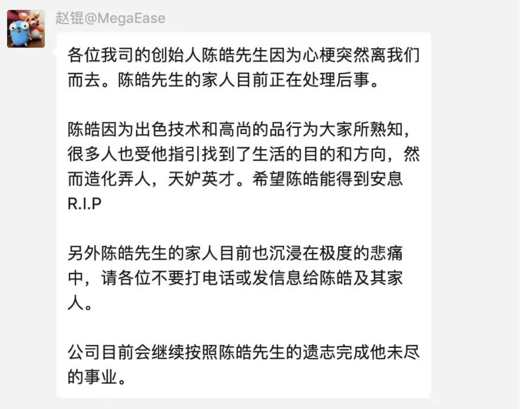 5月15日,多个消息证实,MegaEase创始人、资深技术专家、骨灰级程序员,年仅47岁的陈皓于上周六(5月13日)突然心梗逝世。截至澎湃新闻记者发稿,MegaEase官网已经转成“黑白”以悼念公司创始人。