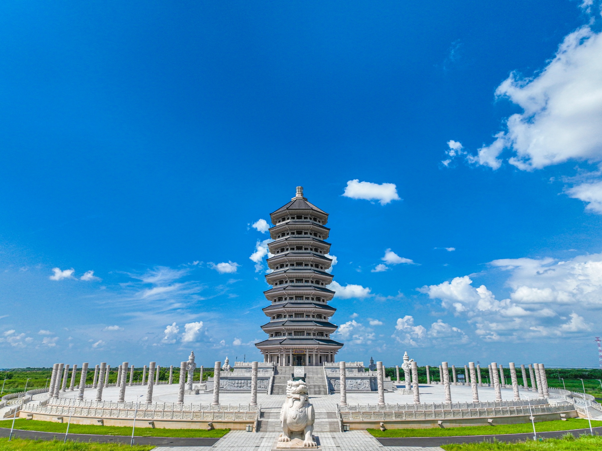 东极宝塔位于黑瞎子岛东北部极角,主要景观设施有宝塔、“神龟探水”“麒麟献瑞”“中华东极宝鼎”、大型浮雕“华夏长卷”等。东极宝塔采用八角形,属汉唐风格。广场两个极点分别布设龟和麒麟,有祈求风调雨顺、太平盛世的美好寓意。广场布设60根青石盘龙浮雕柱,周边的56根代表中华56个民族,另有4根擎天精雕龙柱设置在塔基四角。