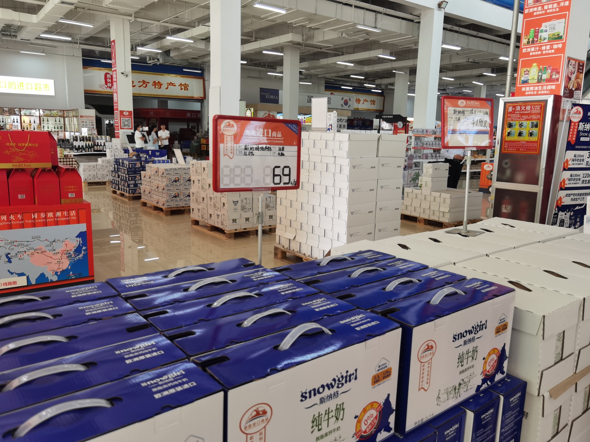 走进郑欧班列进口商品展示体验中心大厅,各种洋货琳琅满目,白俄罗斯欧惠特牛奶、德国斯纳格酸奶、法国芮贝特红酒、意大利乐贝蒂起泡酒……犹如一场“万国博览会”。