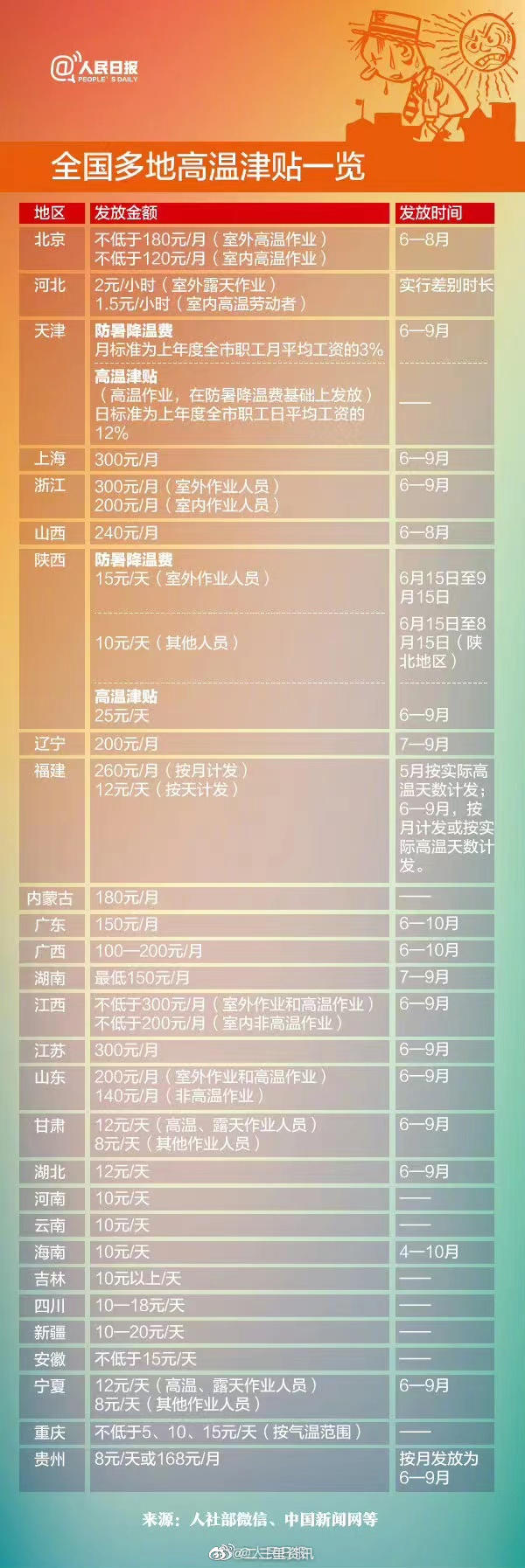 目前31个省份的高温津贴标准集中在100元至300元之间。