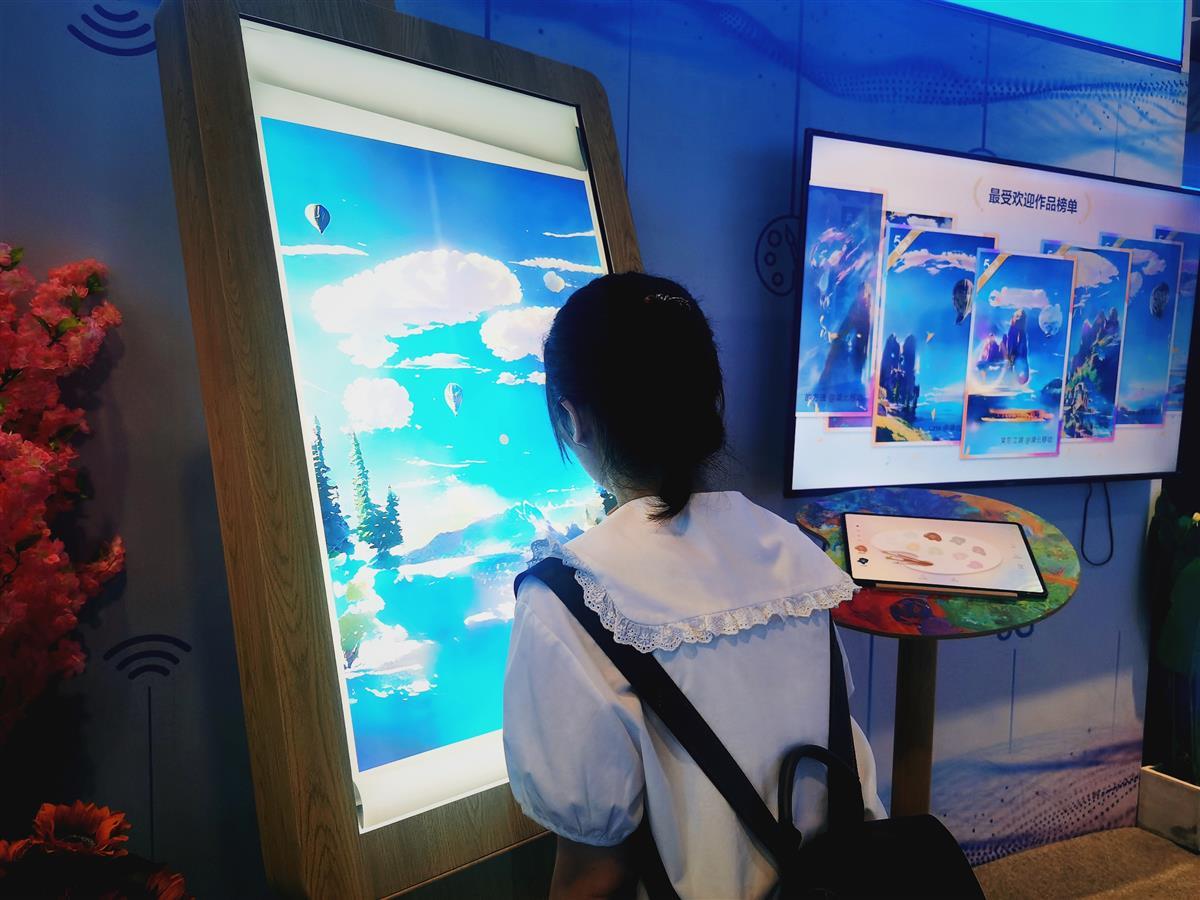 在AIGC(AI generated content,人工智能)画廊展区,不少逛展者在打卡近期爆火的AIGC绘画。