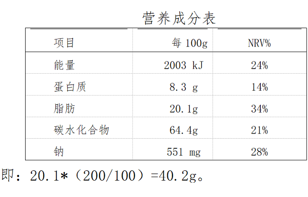 每份、每100g、每100mL,这三种标示方式都符合规定。要注意的是,如果某份食品营养标签中标示的是每100g或每100mL,而要了解此食品中营养素的含量,切记不能只看第二列数字,还得看该食品的总重量或总体积。比如:某食品总重量200g,脂肪为20.1*(200/100)=40.2g。