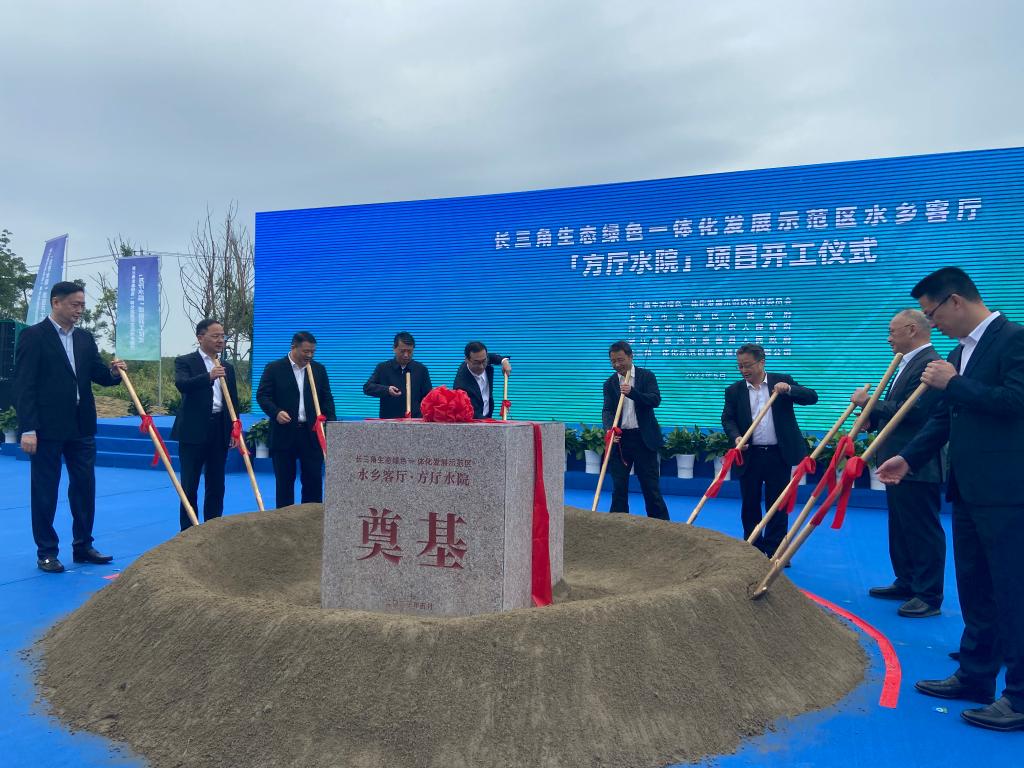 随着沪苏浙两省一市相关代表同步将木桩打入同一片土地,5月24日,长三角一体化发展标志性建筑之一——“方厅水院”正式开工。