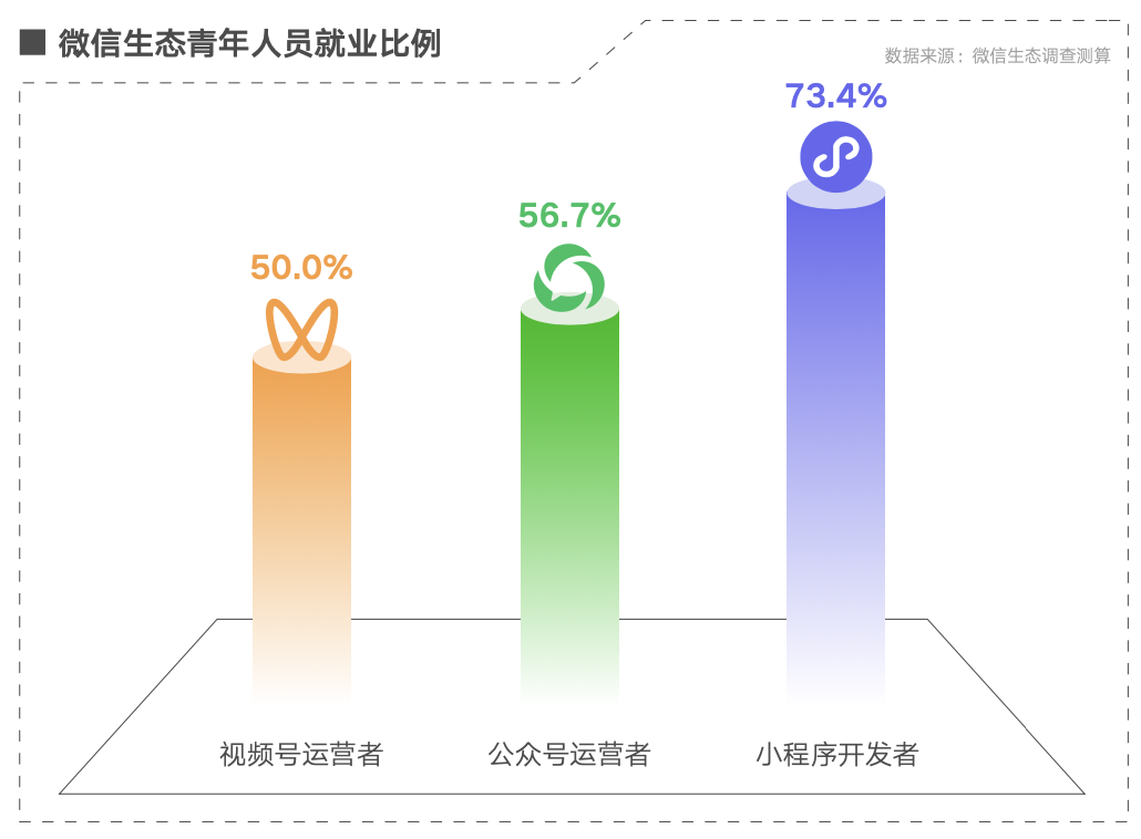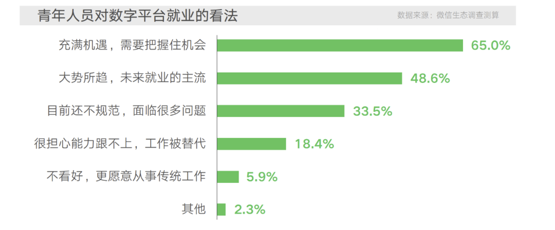 得益于微信公众号、小程序、视频号等构成的数字平台在网络普及推广、数字技术助力、进入门槛较低、从业条件便利等方面的优势。数字生态职业正得到年轻人的青睐,进而吸纳大量青年群体进入,形成新的就业“蓄水池”。